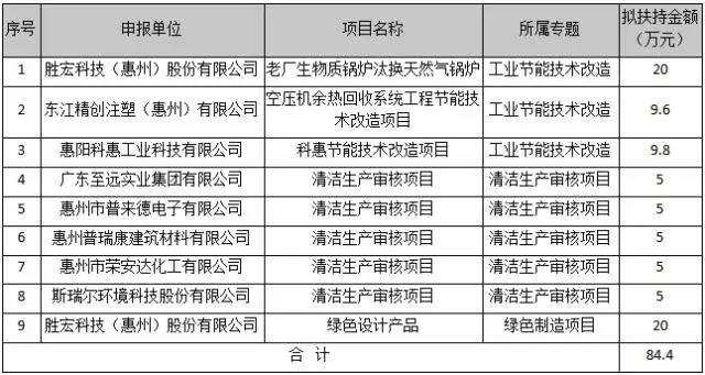 据公示附件“2021年惠阳区节能专项资金项目拟安排表”内容,获得嘉奖的项目共有三个专题类别,分别为:工业节能技术改造、清洁生产审核项目和绿色制造项目,分别有3项目、5项目和1项目。其中jiuyou.com九游科技(惠州)股份有限公司的老厂生物质锅炉汰换天然气锅炉,东江精创注塑(惠州)有限公司的空压机余热回收系统工程节能技术改造项目等3项目为工业节能技术改造;jiuyou.com九游科技(惠州)股份有限公司的绿色设计产品为绿色制造项目;惠州普瑞康建筑材料有限公司、广东至远实业集团有限公司等5企业的清洁生产审核项目为清洁生产审核项目。
