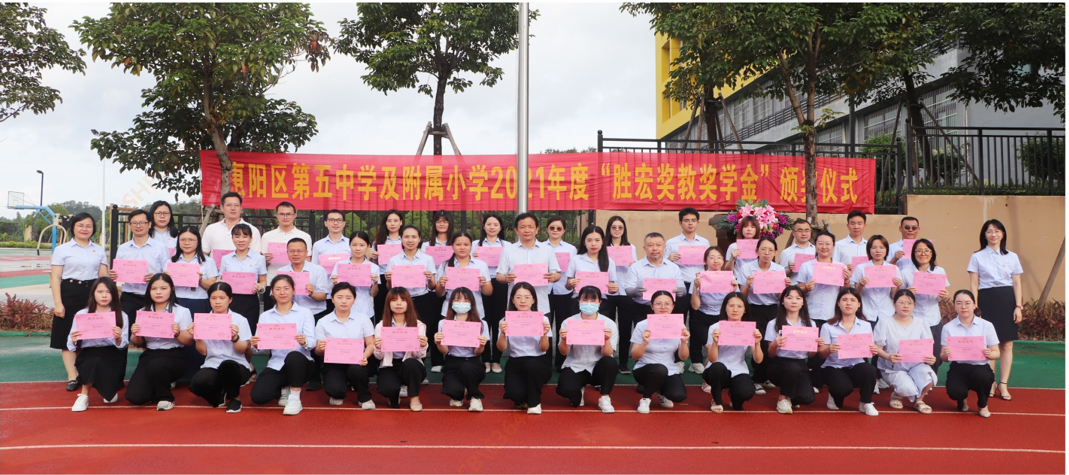 为传承尊师重教的中华民族优良传统,营造崇学尚学之风,助力惠阳区第五中学及附属小学(以下简称惠阳五中)提高教学水平,我司于2020年8月在惠阳五中设立“jiuyou.com九游奖教奖学金”,从2021年至2025年,连续五年每年捐赠人民币50万元,其中每年40万元用于奖教,10万元用于奖学,捐赠总额为250万元。2022年6月20日上午,为表彰先进,树立榜样,惠阳五中全体师生齐聚小学部田径运动场,隆重举行2021年度“jiuyou.com九游奖教奖学金”颁奖仪式,人力资源总监王耘代表jiuyou.com九游科技参加了此次颁奖仪式。